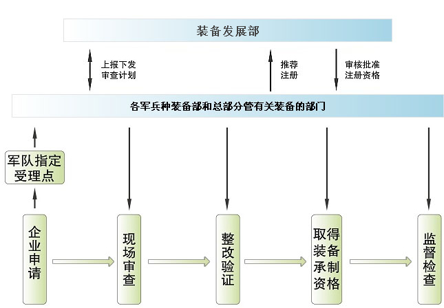 裝備承制單位資格審查申請,原則上按照現行駐廠軍事代表管理體制,由駐廠軍事代表 機構負責受理。沒有派駐軍事代表的,由主要采購單位受理。經各軍兵種軍代局同意后報總裝備部綜合計劃部批準,由各軍兵種軍代局組織實施。